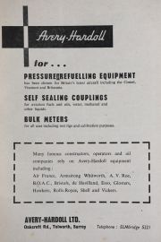 1954 Avery-Hardoll, Ltd. Designers and manufacturers of pressure refuelling equipment; self-sealing couplings for aviation fuels, oils, water, methanol and other liquids. Directors: Sir Walford H. Turner, J.P.; Sir Percy Mills, Bt., K.B.E.; J. W. Muirhead, O.B.E. (Managing), J. Fraser, O.B.E. {Technical), F. Giros; D. C. North; J. Borotra. Senior Executives: J. M. Bailey {Secretary), D. F. Hannan {Sales Manager, Industrial Dept.)', R. H. Edmead {Technical Liaison). Head Office: Oakcroft Road, Tolworth, Surbiton, Surrey. T.: Elmbridge 5221-7. T.A.: Hardolpump, Phone, London.[4]