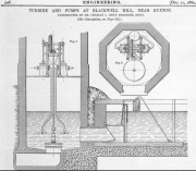 1880 Description of a small pumping plant, consisting of a turbine and set of pumps erected for the Midland Railway Co. in the valley at Blackwell Mill, near Buxton. 'The machinery was at first put down to raise water from an engine working a stone breaker, but the supply is we believe now used for a water crane also. The original inquiry was for a pump to raise 300 gallons per hour 82ft. high, but the machinery we illustrate was, when fixed, found to raise 480 gallons p er hour 102 ft. high. .... This arrangement of pumps has been used by Mr. Hett in connexion with a 10 ft. water wheel (cast complete in three parts) for the supply of Longhills and Branston Grange, near Lincoln, and he has also employed the same type in connexion with wind engines, for which it is admirably adapted. ...'. See illustration.[2]