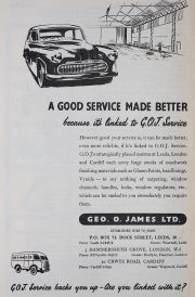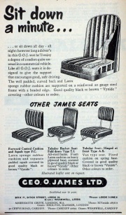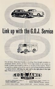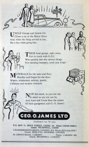 1954 James, Geo. O., Ltd. Head Office: 28, Dock Street, Leeds, 10. T.: Leeds 31845-6. T.A.: Wearwell Leeds. Works: Marshall Mills, Marshall Street, Leeds, 11. T.: Leeds 29230. London Office: 3, Hammersmith Grove, London, W.6. T.: Riverside 2856. Aircraft interior equipment, blinds, seating made from leather, etc.[1]